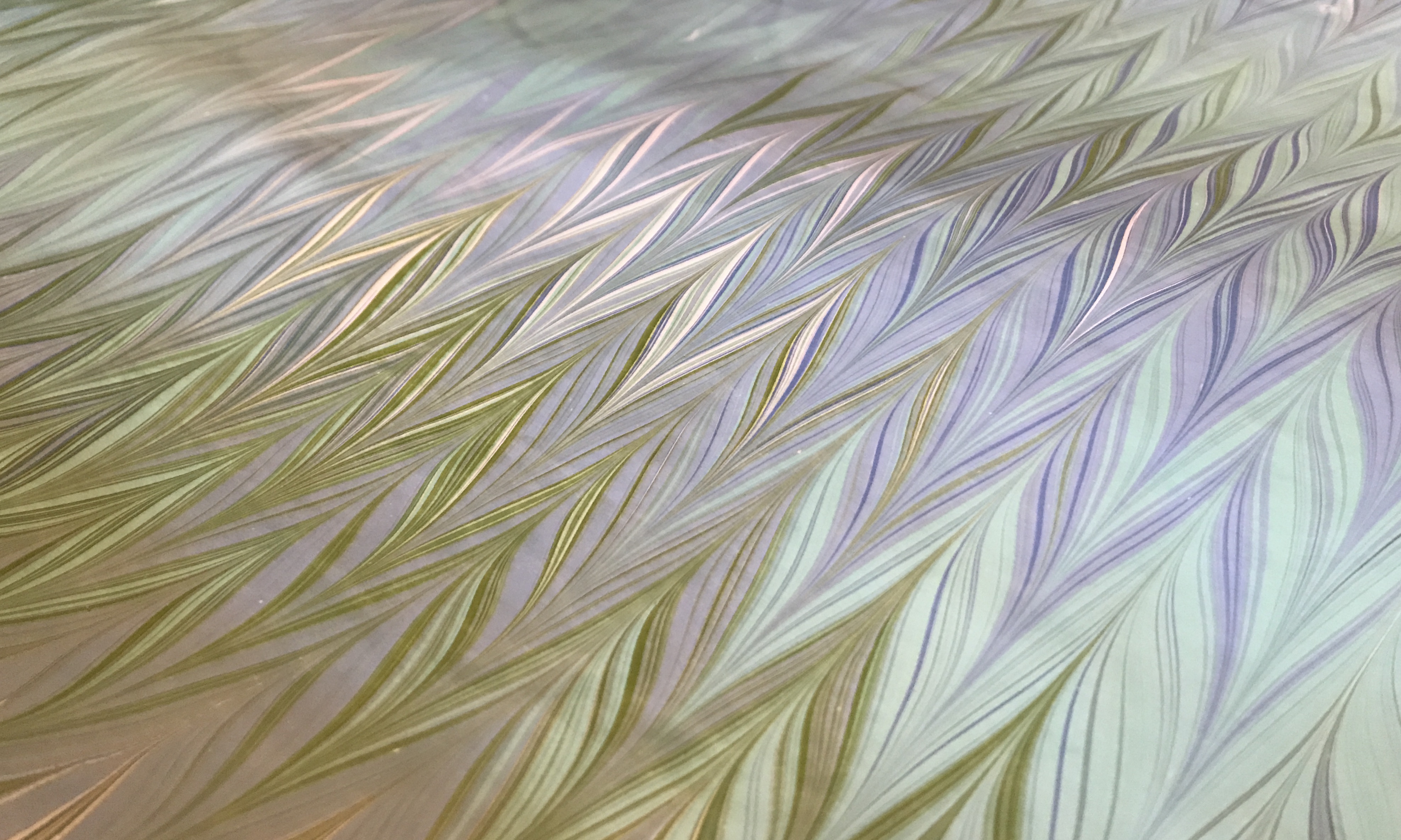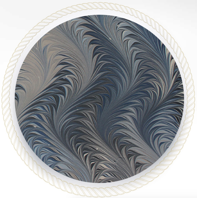 The art of paper marbling was brought from Turkey to Europe in the 1600s. The beautiful paper was often used to decorate the end sheets of finely bound books in the eighteenth and nineteenth centuries. To make marbled paper, the artist drops paint onto thickened water and transfers the resulting pattern onto a piece of paper or silk. The paint may only be transferred once. The fluid dynamics of the process ensure that no two sheets of marbled paper are ever exactly the same.